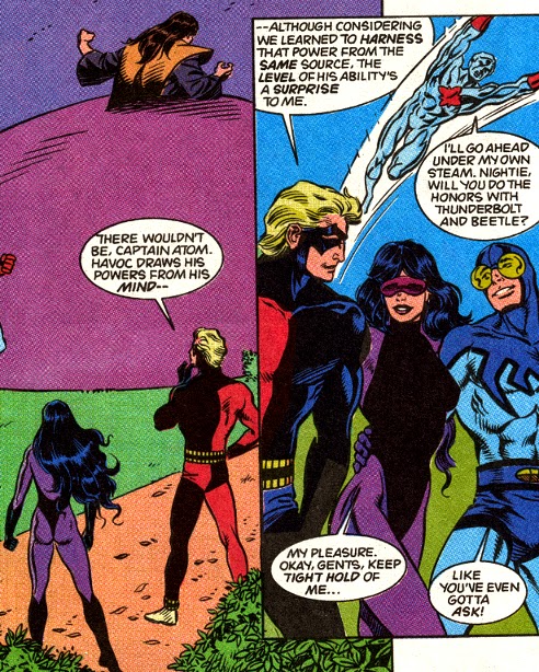 So, yeah- this issue features a reunion of the former (and super cool, original Watchmen) Charlton Comics characters: Captain Atom, Blue Beetle, Nightshade, Judomaster, and the unfortunately; absolutely (and horribly) uninteresting OZYMANDIAS Thunderbolt.