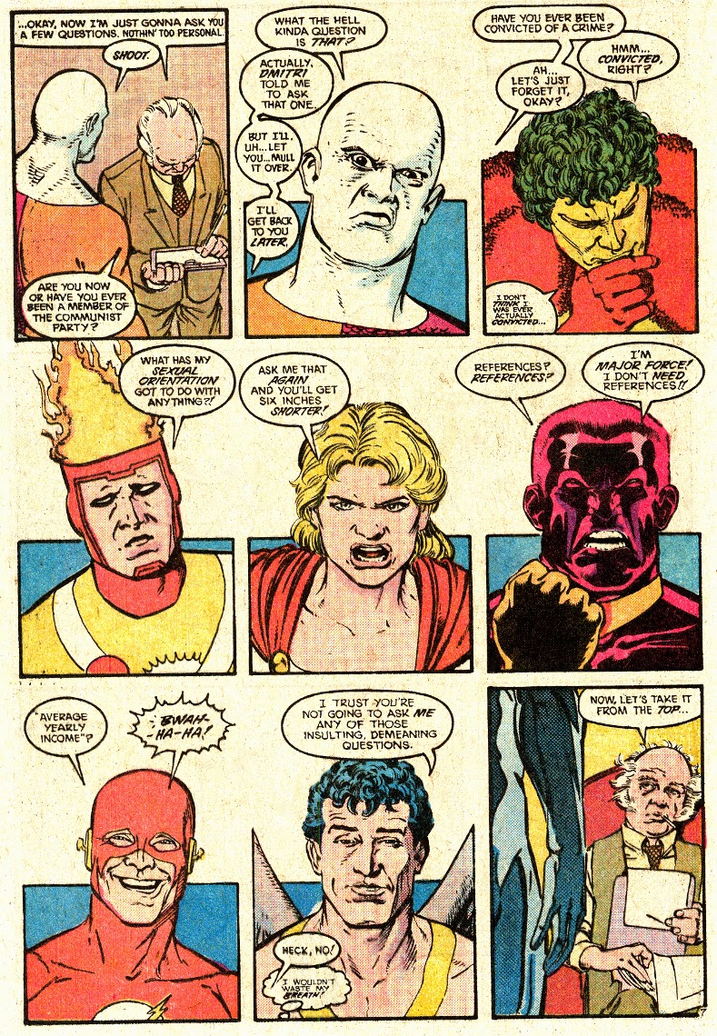 that is one disturbing Joker looking smile from Metamorpho. and what's up with Power Girl? I've seen bull dykes in San Francisco that were more feminine then that clip art with PG. all that aside that was some pretty funny dialogue with those questions.