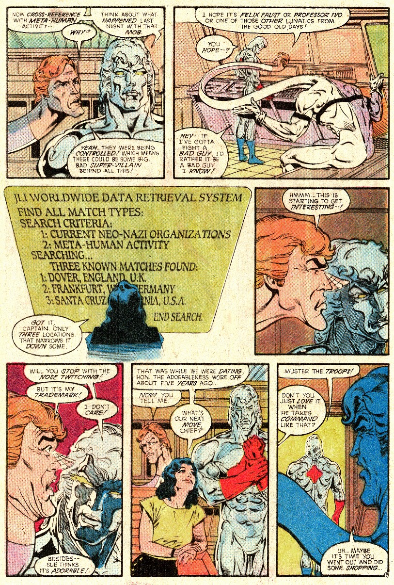 -So much going on here: The great dynamic Sue and Ralph Dibny have, the classic nose joke/reference, Sue lusting over Captain Atom's hot bod (and hair, because let's be honest: It's spectacular), and the all but visual verification that Elongated Man uses is powers in the bedroom... to unforgettable effect. (Justice League Europe #2)