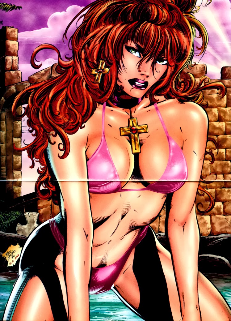 Anyways- on with the subject of today's post: Rob Liefeld created Avengelyne, along with former Vampirella convention model; Cathy Christian- with her also being the model for the character, because... well, because like any other guy who saw her dressed as Vampi back in the day- he probably wanted to fuck her: