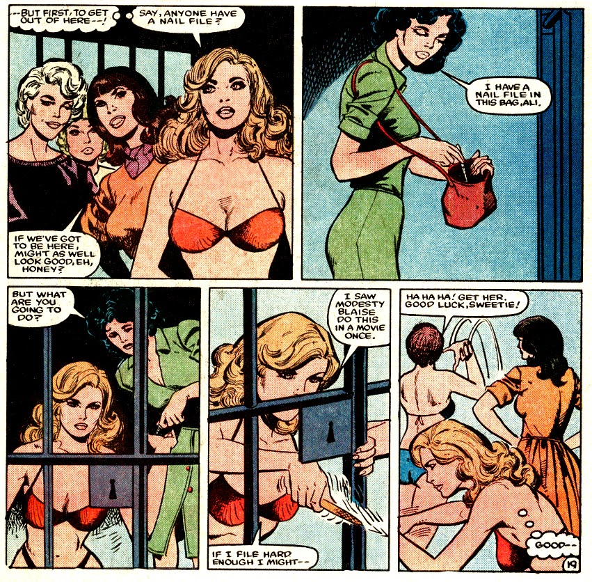 But yeah, anyways, there is totally a women in prison / Caged Heat vibe going on too! And you can tell Geoff Isherwood loved drawing every minute of it.