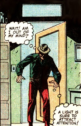 Back to issue #61 though; in which we get a classic scene of an "incognito" super-villain breaking into a place; baggy coat and pants, brimmed hat pulled down to hide his face, sticking to the shadows... you know, like they do: