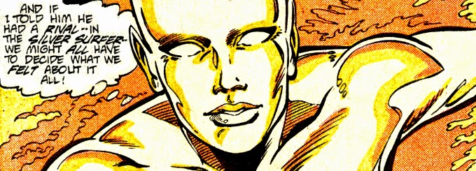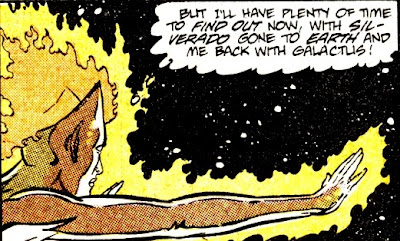 DeleteIt's strange I never really remembered this character development... but looking back- it's very obvious. In this very issue- when she goes back to Galactus' ship it appears that he is dying and she freaks the fuck out! -Saying how she'll find him the nearest planet to eat- fuck whoever happens to be living on it. So out of character for her; she's got it real bad for The Big G's big 'd'.
