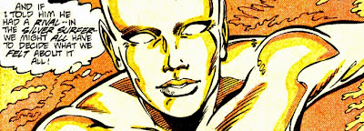 It's strange I never really remembered this character development... but looking back- it's very obvious. In this very issue- when she goes back to Galactus' ship it appears that he is dying and she freaks the fuck out! -Saying how she'll find him the nearest planet to eat- fuck whoever happens to be living on it. So out of character for her; she's got it real bad for The Big G's big 'd'.
