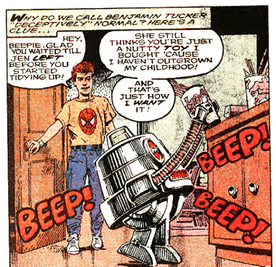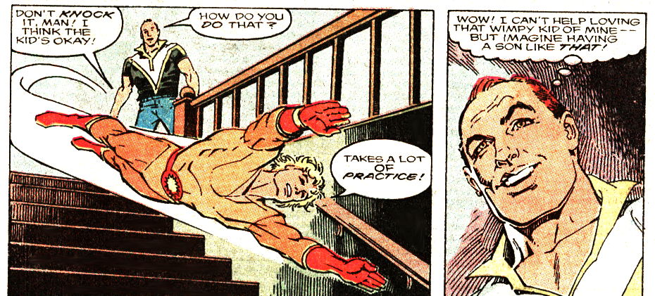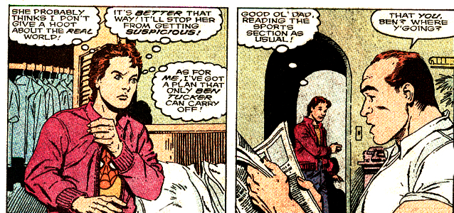 Stan Lee is just revisiting shit from issue one... Ben Tucker likes comics, his Father thinks comics are for fucking nerds, and he wishes his Son was a cool jock instead! The dorky kid just want's to tell his Dad that he's Solarman, so he'll finally be proud of him... -Yadda, yadda, yadda...
