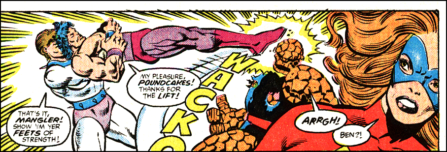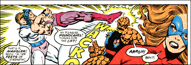 -This is back when The Thing was not in The Fantastic Four (replaced, obviously, by She-Hulk) and instead was CM Punk's favorite wrestler in the UCWF (Unlimited Class Wrestling Federation): Where people were given augmented powers and terrible names (like Left-Winger, or Mr. Clean), then made into drug addicts, by the Power Broker. Comics are so weird...